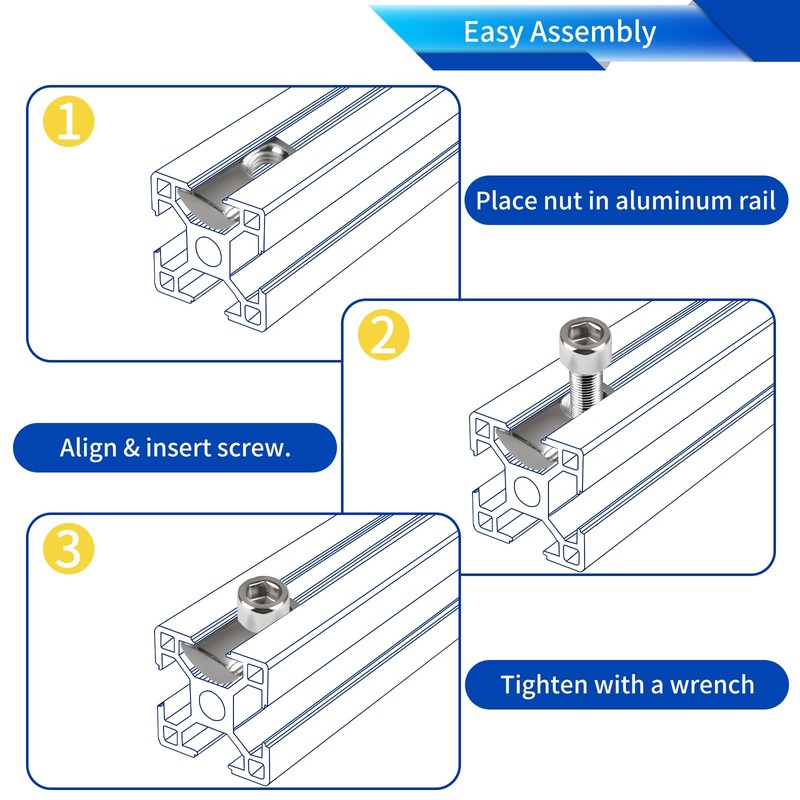 • Universal EU standard compatibility: slot nuts comply with European standards and fit all series 20 aluminium profile systems (e.g. 20 x 20, 20 x 40). Note: For special profiles may be Custom-made product.