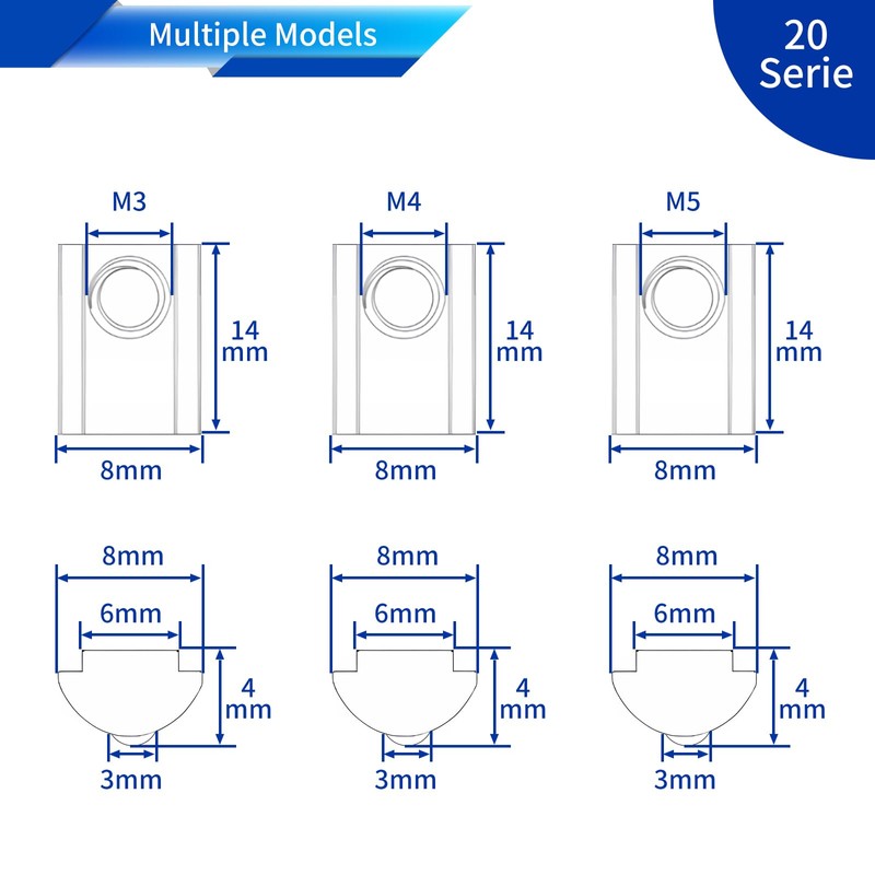 • Slot nuts size: This M4 slot nuts contains 50 pieces of 20 series T-slot nuts M4 for aluminium profiles with 4 mm grooves. Dimensions: L x W x H = 14 x 8 x 4 mm. Slot width: 4mm The surface of the lock nut is nickel plated, which provides good rust protection.