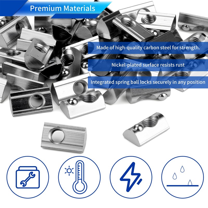 1. T-nuts are made of high quality carbon steel with high hardness and long service life. Nickel plating has good anti-rust performance.