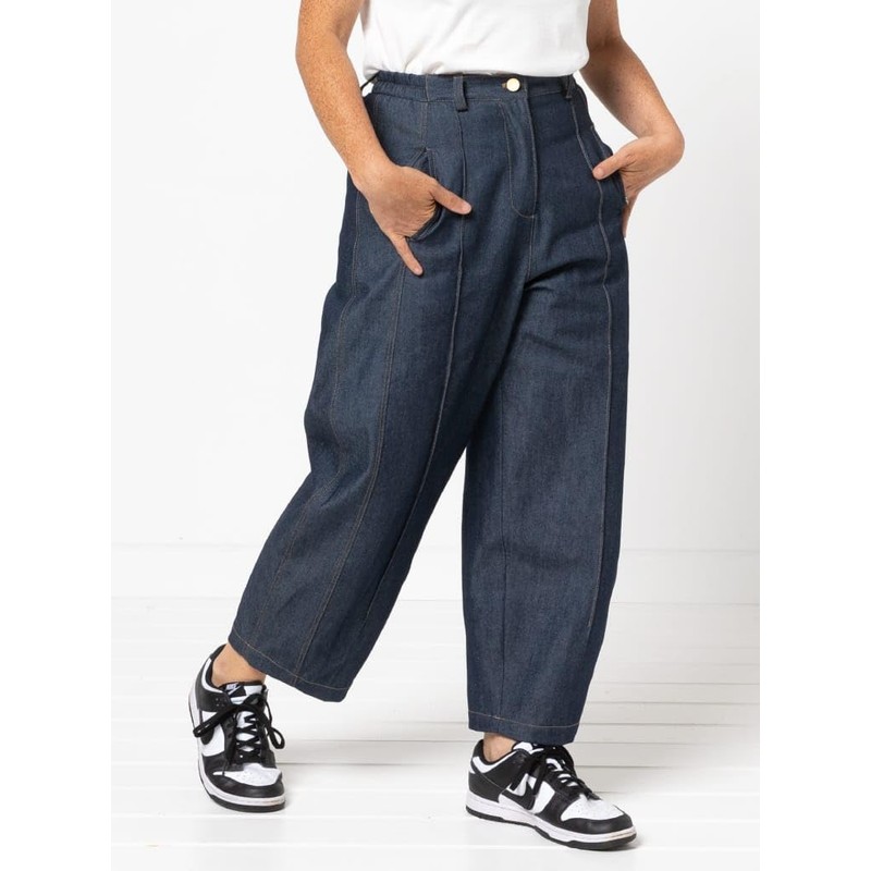 - This is a jeans sewing pattern from Style Arc. This gorgeous cropped length, barrel-leg pant style features a fly front, button front waistband, elastic back waistband, in-seam pockets, and front and back leg pintucks. Make it in denim, drill, cotton or linen.
