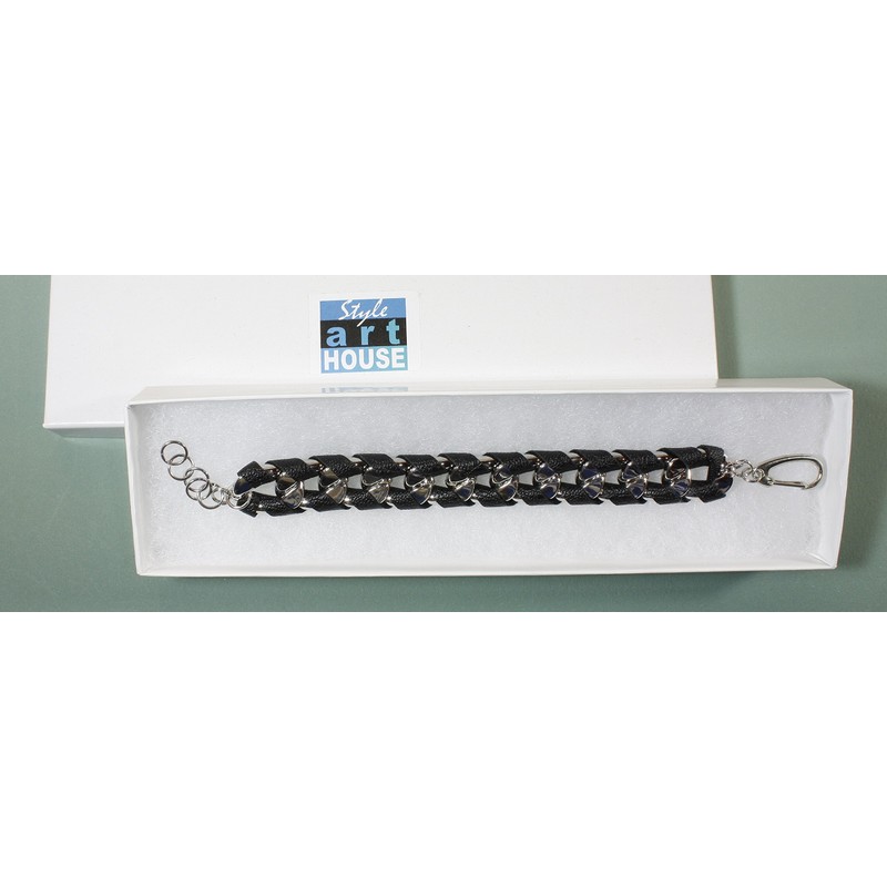- Metal curb chain links are wrapped in a black faux leather strap