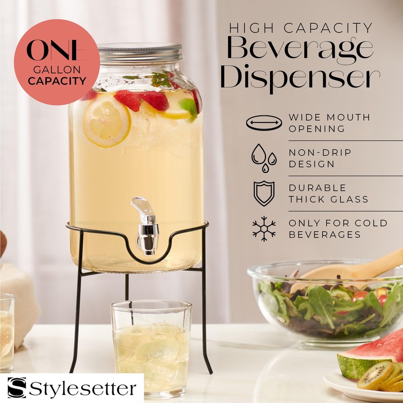 Style Setter Beverage Dispenser with Stand - 1 Gallon Large Countertop Glass Drink Dispenser with Spigot & Lid - Party Drink Dispenser for Sweet Tea Lemonade Punch Water, Juice Dispensers for Parties