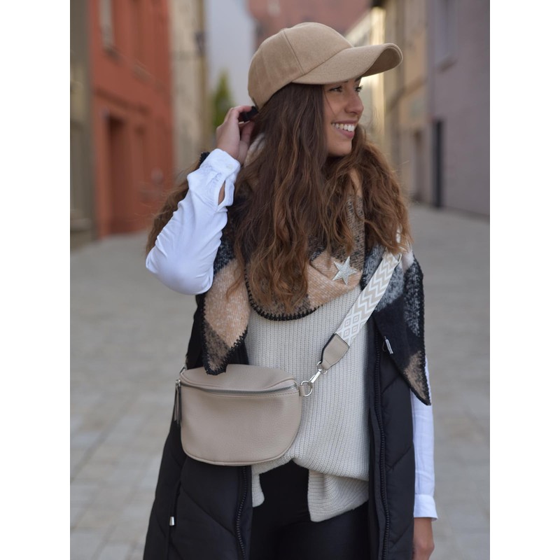 The elegant 2-piece set consisting of a half moon shaped handbag, which can be worn as a crossbody bag or shoulder bag, and a small round purse that can be attached to the shoulder strap, rounds off your outfit perfectly. The bag can be closed with a 2-way zip and has a zip pocket on the back for extra storage space. The main compartment of the crossbody bag offers enough space for a wallet, keys, smartphone and small items that you want to always have at hand on the go. The wide shoulder strap with zigzag diamond pattern made from high-quality woven fabric can be removed using the carabiner. So you can give your plain shoulder bag an individual style at any time and can restyle it for any occasion.