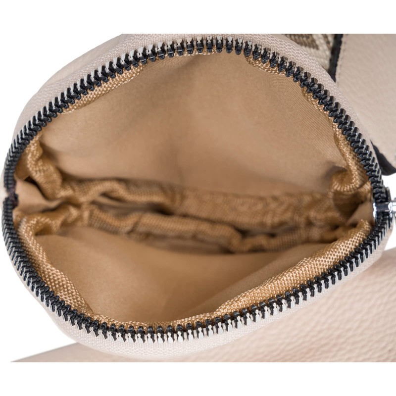 Wide strap made from high-quality woven material with faux leather hemmed strap ends for more stability and eyelet for attaching the small round purse.