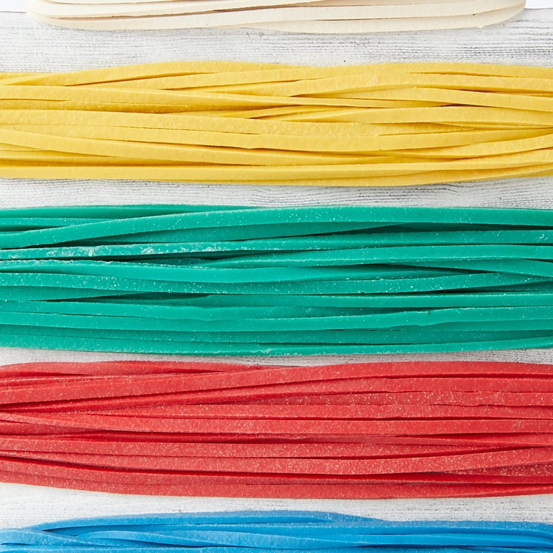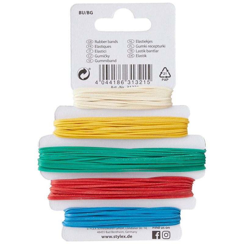 Die STYLEX Gummibänder beinhalten 95 Stück. In 5 verschiedenen Farben und Größen im Durchmesser von 90 mm, 120 mm, 130 mm, 150 mm und 180 mm.