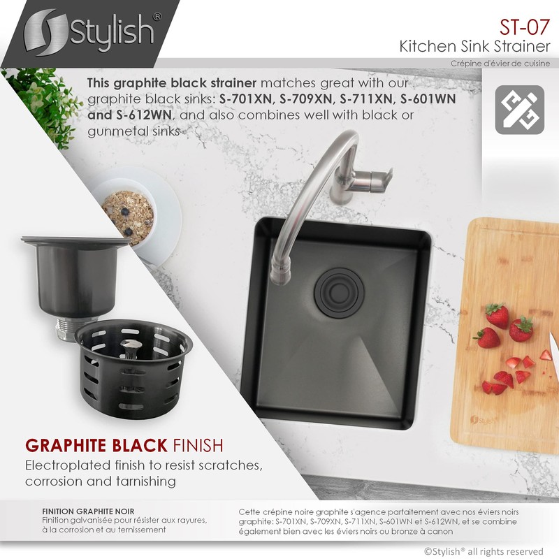 - EXCELLENT DESIGN: This graphite black sink drain strainer lets water pass through but not food particles. Easy to remove and clean, deep stainless-steel waste basket. The modern design and brushed finish will perfectly match with your sink and faucet.