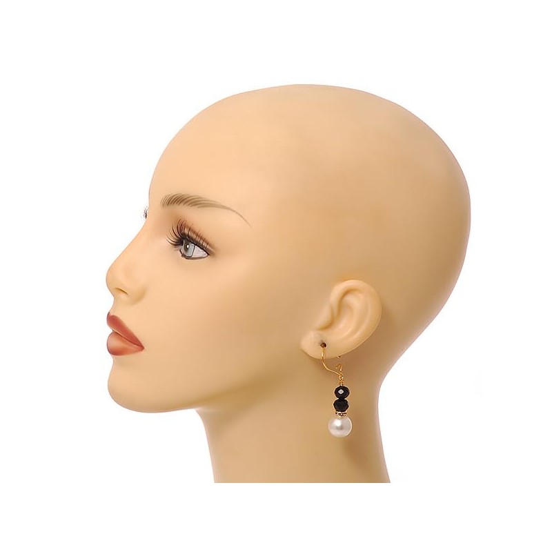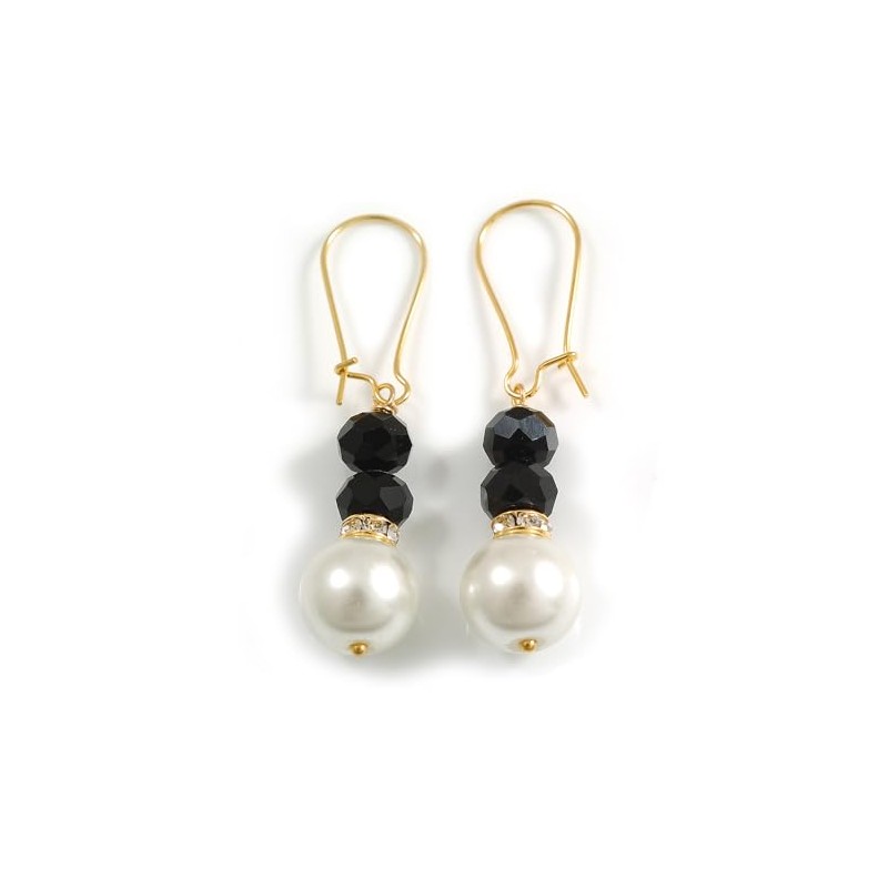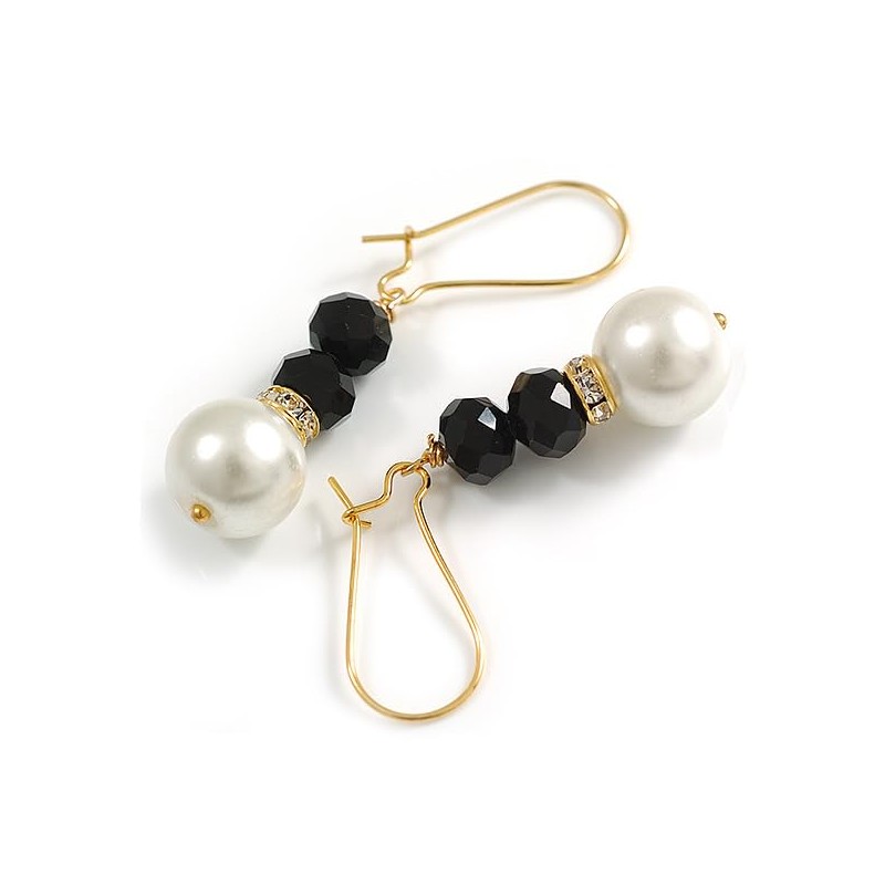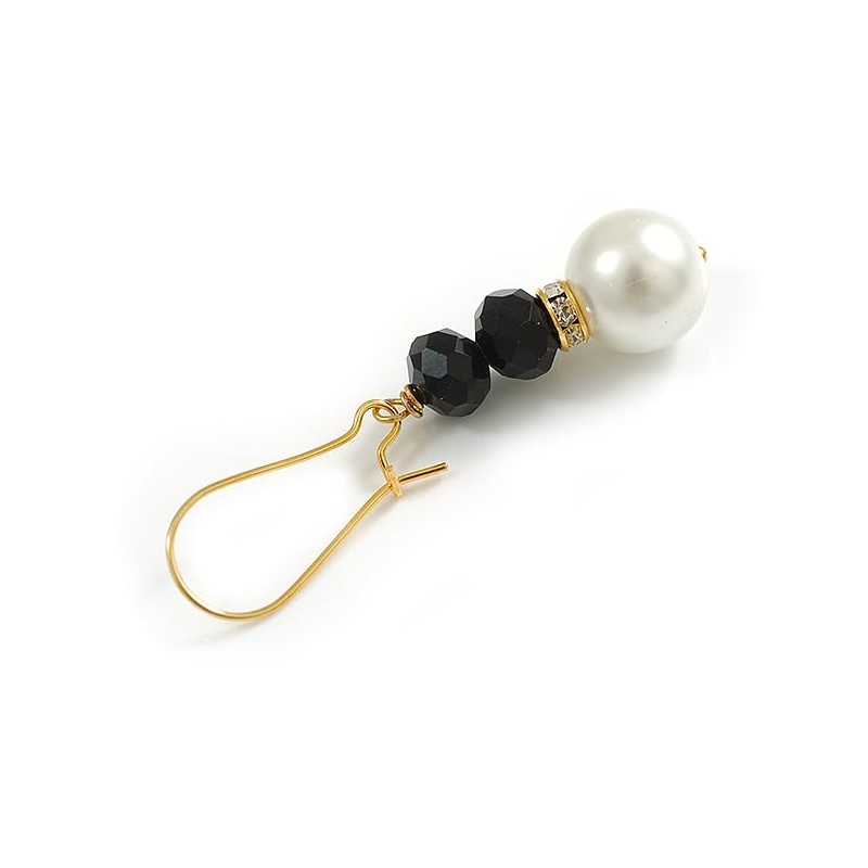 Stylish Black/White Glass Bead Drop Earrings With Gold Tone Bean Shape Hook Closure - 5cm Total Drop