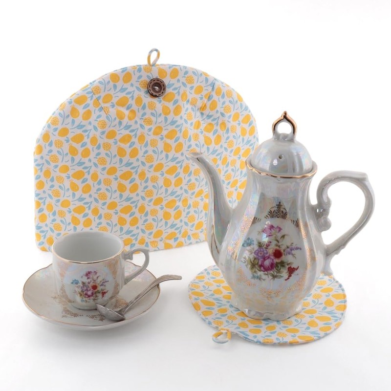 - A tea Cozy and mat set made by D'Collectibles fabric carefully handmade by skilled artisans at the Isle of Atelie. (This set is original in our store and not available in other stores