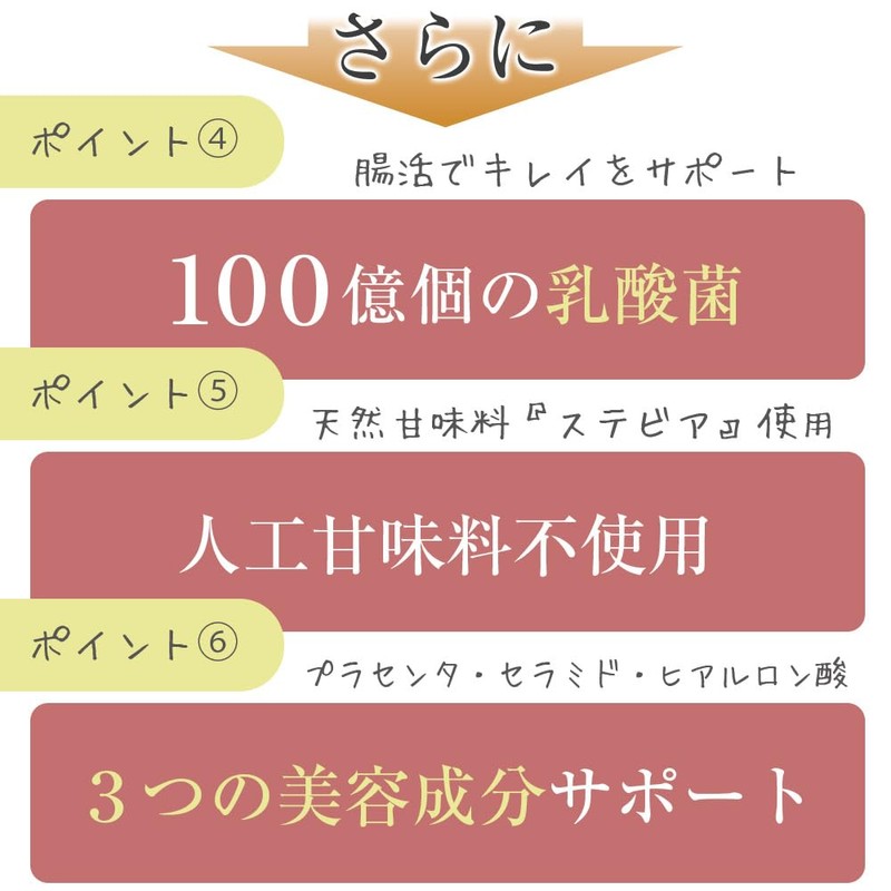 - 1杯で、11種類のビタミン、8種類のミネラル、乳酸菌100億個、プラセンタ、セラミド、ヒアルロン酸、たんぱく質16gを摂ることができるプロテインです