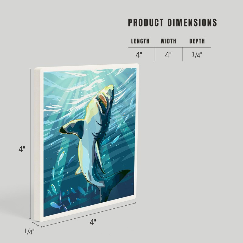 - Stylized Great White Shark (Absorbent Ceramic Coaster, Single, Cork Back, Kitchen Table Decor), each coaster measures 4x4 inches.