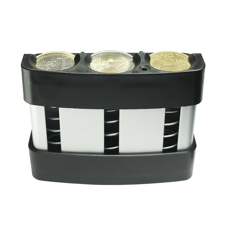 Beschreibung: Leichte Geldbörse aus hochfestem Aluminium. Speziell für Euro-Münzen (außer 1 und 2 Cent) konzipiert. Ideal für die organisierte Aufbewahrung von Münzen im Auto – Parkuhr-Zahlung, Autobahngebühren, Verkaufsautomaten, Parkplätze, Sparschwein, damit Kinder lernen, mit ihren Münzen umzugehen. Materialien: eloxiertes Aluminium T5, BASF-Polyamid aus der ULTRAMID-Serie, Federn aus verzinktem Stahl. Maße: 8,6 x 6,6 x 3,3 cm. Es wird in einem kleinen Loch im Fahrzeug in der Tasche aufbewahrt. Gewicht: 100 Gramm. Fassungsvermögen: insgesamt bis zu 45 Münzen. Großer Widerstand, Komfort und Präzision. Vollständig in der Europäischen Union entworfen und hergestellt.