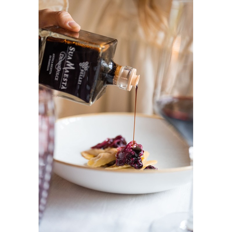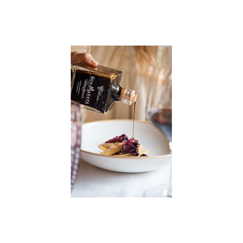Sua maestà or "your majesty" is certainly a balsamic vinegar condiment deserving of its name. It's handcrafted in the heart of Modena, Italy with only Italian vineyard grapes. This aromatic, thick, dark brown, lusciously elegant and complex bittersweet balsamic vinegar is highlighted with rich and rustic, yet sweet oak wood notes. It is made with passion and attentive perseverance by a family owned estate in the heart of Modena, Italy. The low 4% acidity brings out the emphasis on the rich oak wood notes. Sua maestà dense dolce can be drizzled on your freshly prepared spring greens, such as arugula. You may also add it to enhance the flavor of cooked meat, artisan cheeses, vegetables, sweet potatoes or strawberries. The luxurious bottle exhibits sua maestà's artistic and culinary masterpiece with a symphony of exquisite flavor. Zero artificial, zero additives, non-gmo, naturally gluten free. Ingredients: Cooked grape must with a hint of a vintner's wine vinegar, contains naturally occurring sulfites.