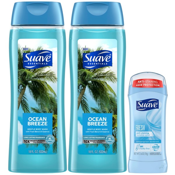 Suave Body Wash Ocean Breeze 2-Pack + Fresh Antiperspirant Deodorant – Gentle Body Washes with Vitamin E & Anti-Staining Invisible Solid Deodorant Stick, 48H of Protection