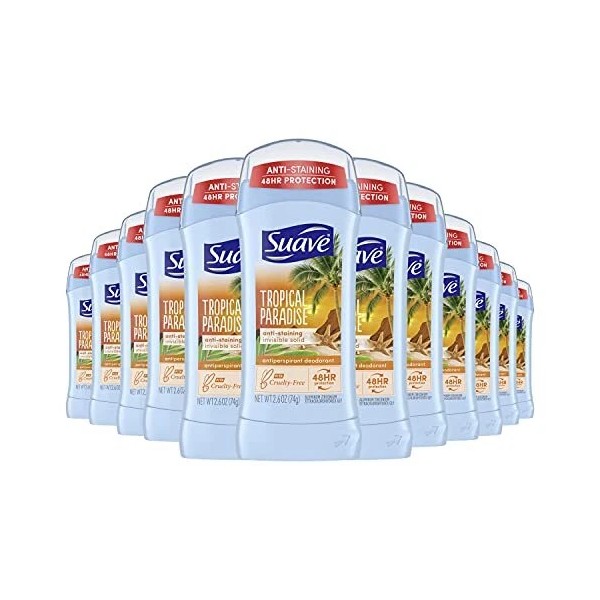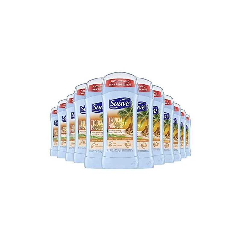 Embrace the scent of the tropics. Suave Tropical Paradise Invisible Solid antiperspirant and deodorant for women is anti-staining and protects for 48 hours. Our women’s deodorant and antiperspirant stick provides long-lasting odor and wetness you can trust. So fresh and so clean. Suave’s anti-staining formula stays on skin, not clothes. This deodorant goes on clear, giving you underarm protection without leaving any messy residue. The result: you feel clean and refreshed for 48 hours. Feel clean, smell clean. Suave Tropical Paradise Invisible Solid protects with a vibrant, tropical scent that leaves you to feel fresh and confident for 48 hours. Want to try a new scent Suave Invisible Solid is available in an array of fresh, floral and tropical scents. Choose from Fresh, Powder, Wild Cherry Blossom, Sweet Pea & Violet, Ocean Breeze, Tropical Paradise and Everlasting Sunshine. Find your favorite scent or choose a few! To use: Apply to underarms only. Enjoy long-lasting odor and wetness protection for 48 hours. Globally, Suave does not test on animals and is certified Cruelty-Free by PETA. For Over 75 years, Suave has offered professional, quality products for the entire family, which are proven to work as well as salon brands. The Suave mission is to make gold standard quality attainable to all, so everyone can look good, smell good and feel good every day.