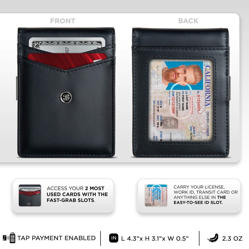 - Fill it as you wish! With 11 total card slots you can keep all your important cards with the style of a leather wallet, but without all the bulk! Carry your ID in the easy-to-see ID slots, and pop your most used cards in the 2 Fast-Grab slots at the front, clip cash into the money clip and slip the Odyssey in your pocket! Size: 4.3 x 3.1 inches