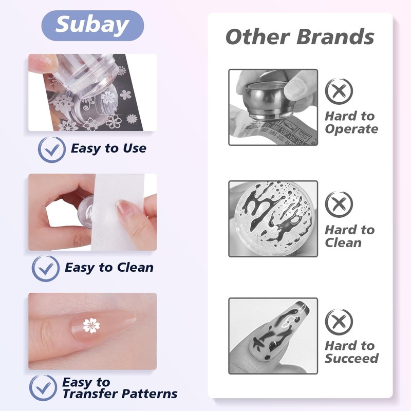 - Complete Nail Stamper Kit - Subay professional French tip nail tool is an all-in-one kit that comes with everything you need to create your nail art. The kit includes pcs nail art stampers, a nail scraper, pcs nail stamping plates, and pcs replaceable silicone jelly nail stamper heads. This tool is ideal for both nail salon techs & beginners who want to experiment with DIY nail art. With its versatile features, this nail stamper kit makes it easy to create unique & stunning nail designs.
