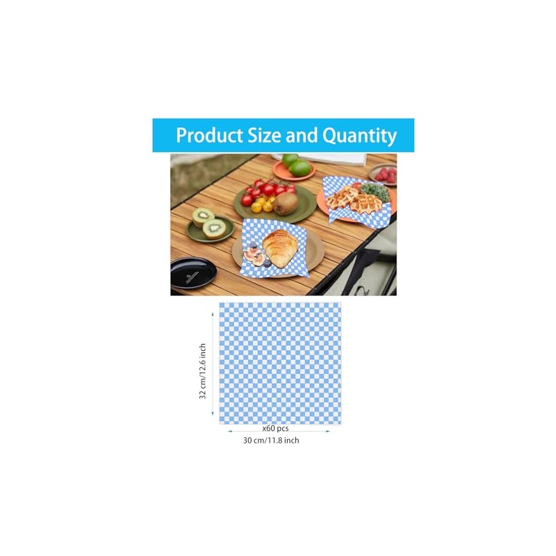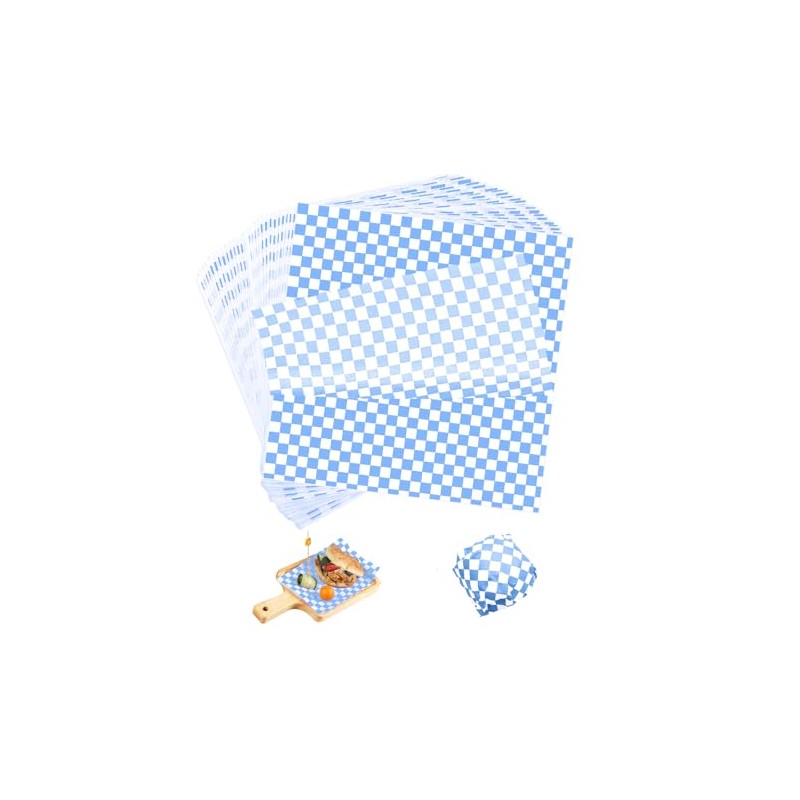 SUCCEFORT 120 Pieces Wax Paper Sheets 12x12 Inch, Food Basket Liners Checkered Wax Deli Paper Sheet for Bread and Sandwiches Fries, Blue