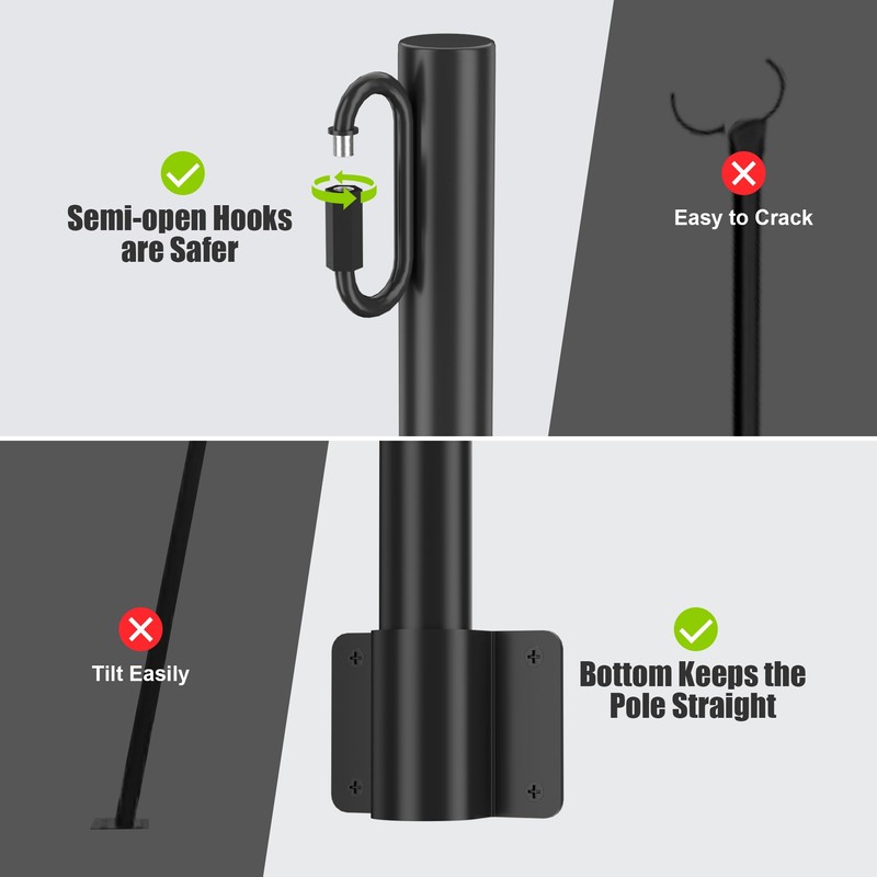 - Installation Easy, Stable: Just fasten the base to the surface with screws. The base is skillfully welded and securely enveloped between the rod and the bottom, significantly enhancing stability and ensuring it remains securely attached, simplifying the installation process. If you need to reposition it, simply remove the screws and adjust. You can install it solo with ease. It's flexible and occupying no ground space. Plus, it's easily disassembled and stored when not in use.