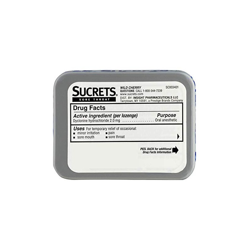 A classic sore throat remedy trusted by doctors and families for generations, Sucrets Wild Cherry Sore Throat Lozenges temporarily relieve occasional minor irritation, pain, sore throat and sore mouth. The lozenges contain dyclonine hydrochloride to provide mouth and throat relief. Allow the lozenge to slowly dissolve in the mouth and may be repeated every 2 hours as needed or as directed by a dentist or a doctor. Recommended for use in adults and children 4 years and older. Sucrets Lozenges come in a convenient, portable tin for fast-acting relief at home and on-the-go.