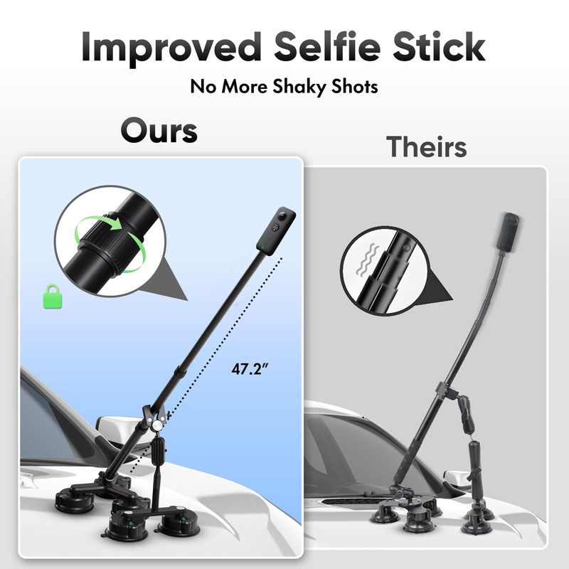 This action camera mount is compatible with a wide range of popular 360 cameras and accessories, including insta360 x4 accessories, insta360 x3, insta360 x2, insta 360 one rs, insta360 one x2, and camera insta360 x4. Whether you're using a 360 camera for car recording or capturing footage from a gopro 360, gopro max 360, or go pro 360, this mount offers maximum stability and versatility. Designed as a camera car mount, it functions as a reliable suction cup camera mount with a solid grip that works as both a camera suction mount and a suction mount for high-speed driving. Its durable five-cup design provides excellent hold, making it a strong fit for go pro suction cup mounts, ulanzi suction cup mount, or other go pro mounts. This setup is perfect for creators looking for a car camera 360, camera mount for car, or a 360 car camera. The adjustable arm makes it ideal as a 360 camera stick, and the enhanced stabilization makes it a top-tier action camera mount or car mount for camera for professional-quality shots. Use it as a gopro car mount, go pro car mount, or insta 360 car mount to capture unique driving perspectives with ease. Compatible with many insta360 accessories, insta360 mount options, and insta x4 models, this solution meets the demands of serious content creators. It also supports 360 camera car mount applications and can be a reliable suction camera mount for filming with a camera suction cup mount in any environment.