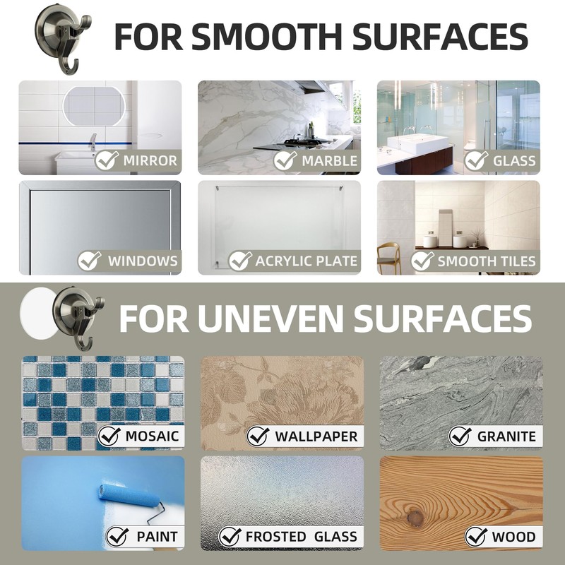 These two flexible installation methods make the hooks widely applicable to various common surfaces, such as windows, mirrors, glass, ceramics, wood, wallpaper, marble, porcelain, acrylic and more, to meet your organization needs in different spaces (such as bathrooms, bathtubs, kitchens, refrigerators, sinks).