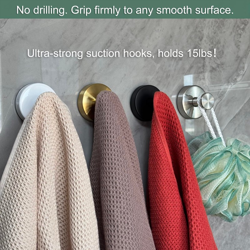 Say goodbye to wall damage! ★ Our revolutionary suction cup hooks stick strong without screws, drills, or messy holes. Just peel, press, twist and hang - it's that easy! Holds up to 15lbs, and removes cleanly when you're done. Your walls stay perfect! ★ Removable and Reusable: Twist counterclockwise to release, then pry with a knife to remove. You can reuse it after washing the suction base. ★These Hooks Hold Like Crazy! Sticks super strong to tiles and glass Holds up to 15 lbs - wet towels, heavy robes, no problem Easy to use: Just press and twist the knob Lasts long: Won't fall off after months of use ★Why you'll love it: ✓ Strong suction + sticky base = stays put ✓ Works in steamy bathrooms ✓ No tools needed - installs in seconds ✓ Removes cleanly when you want "Finally found hooks that actually hold my big bath towel!"