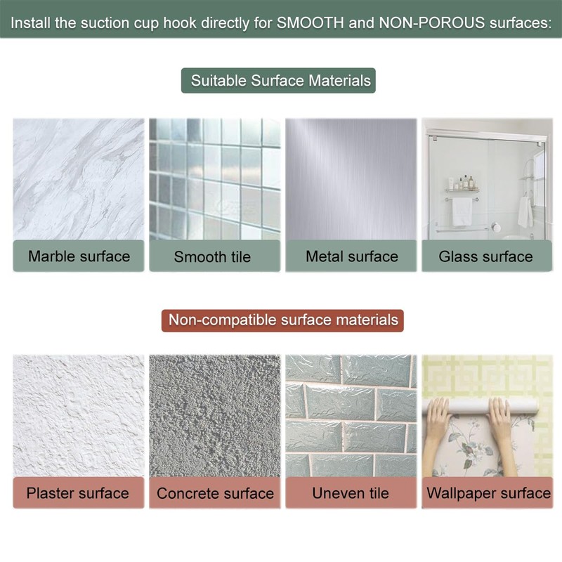 • Applicable Surfaces ★ The suction cup works on smooth, flat, and non-porous surface, such as Glass, Window, Mirrors, Acrylic, Glossy porcelain tiles, Smooth stainless steel, Smooth plastic, Quartz, Laminate.--- Do not install the suction over uneven, rough, porous, textured or curved surfaces like Painted walls, Paster, Concrete, Mosaic tile, Wallpaper and Lime wall etc.