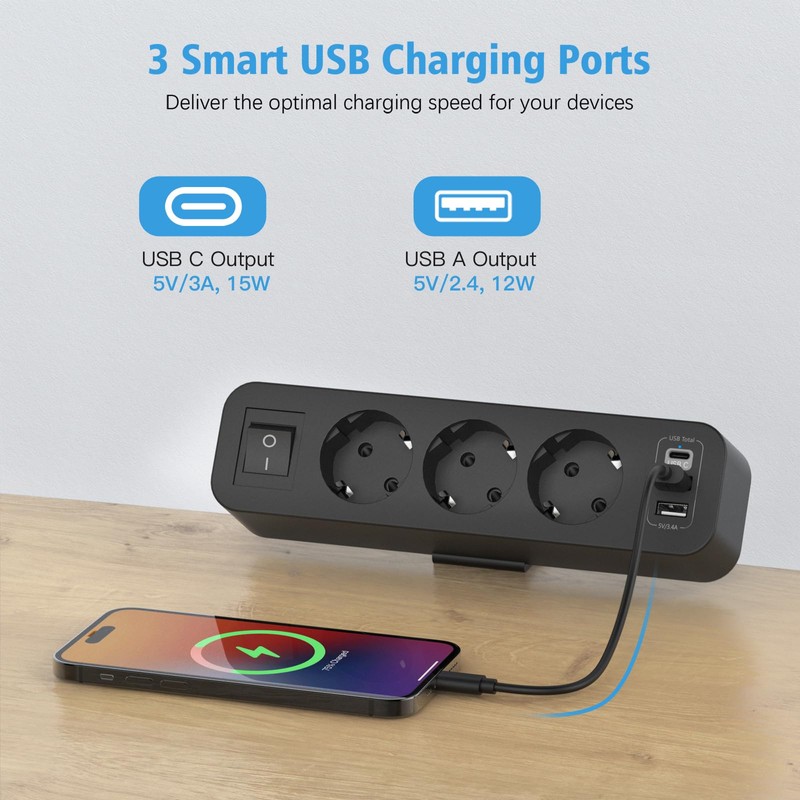 - 6 in 1 Tischsteckdosenleiste: Die Tischsteckdosenleiste mit 3 Steckdosen (Leistung 3680 W/16 A), 2 USB-A, 1 USB-C (Gesamtleistung 5 V/3.4 A/17 W).Eingebauter intelligenter Ladechip. Nach vollst?ndiger Aufladung stoppt es automatisch.Sparen Sie Energie f1r sich.