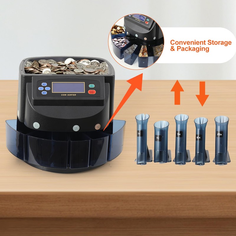 SUDEG Electronic USD Coin Sorter and Counter with LCD Display, 5 Coin Bins and Tubes,Automatic USD Coin Sorting Device for 1¢, 5¢, 10¢, 25¢ Coins,100-150 Coins/Minute
