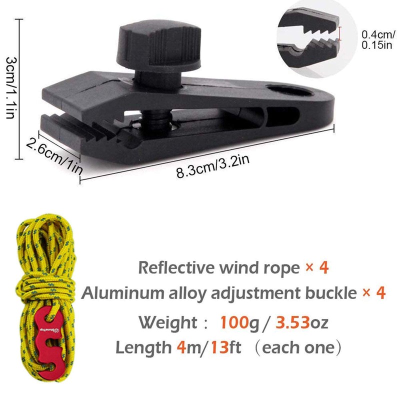 Size: 3.27*1.06*1.22 inch( Tarp clip), 157 inch( Tent Rode)