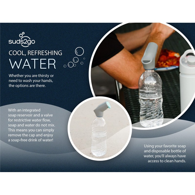 - Suds2Go Refillable Cap - provides for quick, safe, and easy hand washing when on the go. Small enough to fit in your backpack, diaper bag, totes, or vehicles, the portable patent pending design turns most disposable water bottles into a hand washing station