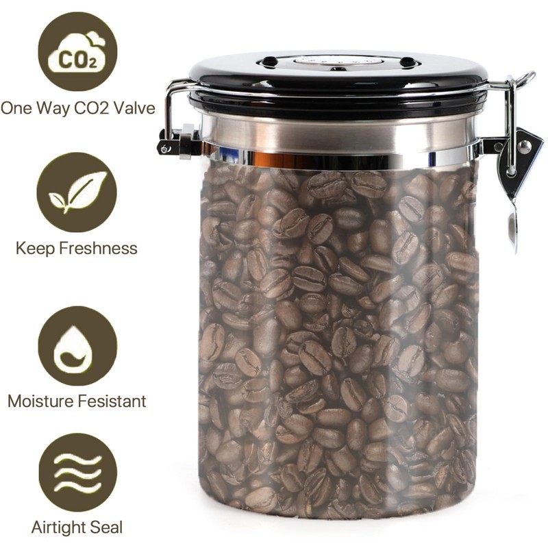 • Airtight Seal to Preserve Freshness - 1.8L coffee canister features an airtight seal that keeps your coffee fresh for longer, so you can enjoy a great-tasting cup every time. With a CO2-Release valve to release CO2 and lock out oxygen.Comes with a 1/8 30ml measuring scoop with smooth silicone handles and 2 extra Valve Filter.