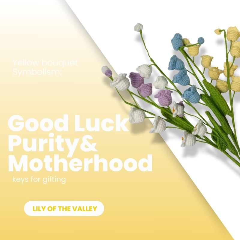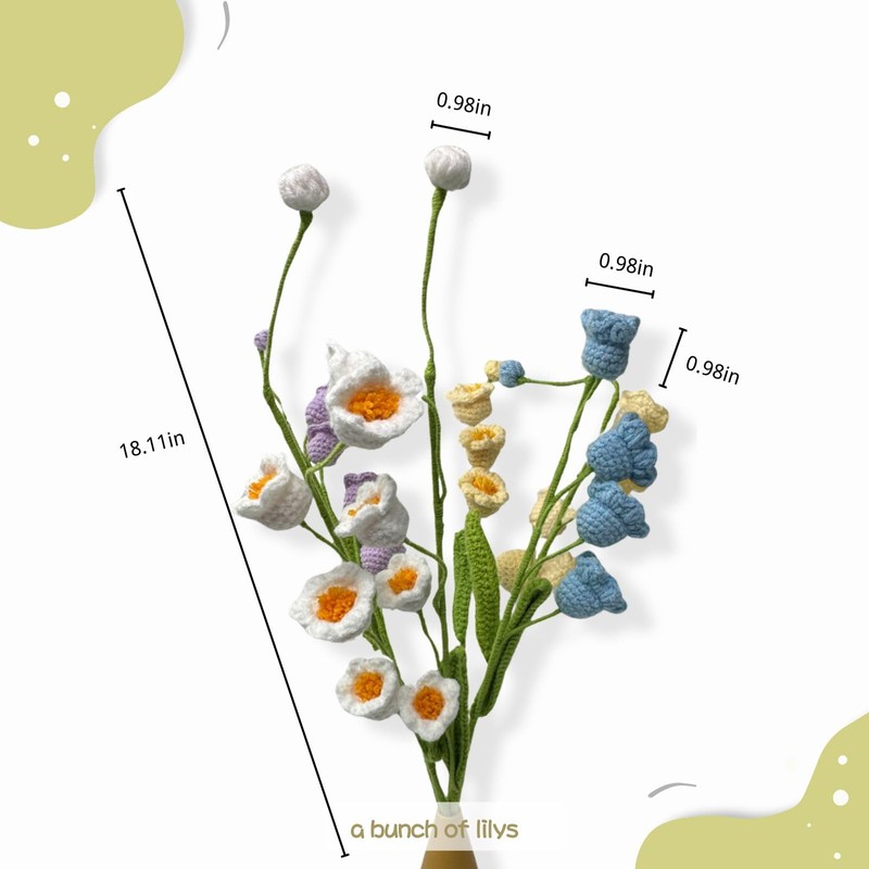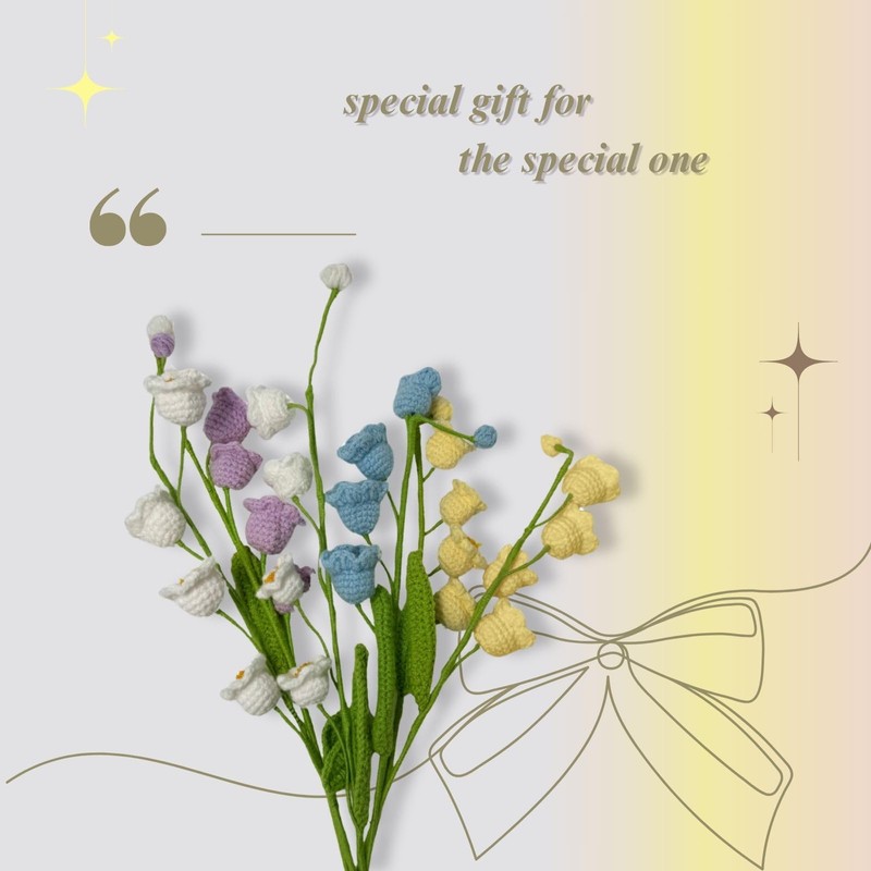 - 【Lily of the Valley Garden Blend】This airy bouquet showcases a cheerful combination of six lily of the valley stems, accompanied by soft crochet wildflowers in white, yellow, blue, and pale lavender tones. Designed to evoke the charm of a blooming spring meadow