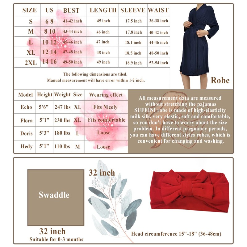 - Soft Mommy Robe and Matching Swaddle Set -SUFEINI maternity robe are available in 5 sizes. The newborn receiving blanket is one size, 32inch * 32inch, headband are suitable for newborn head circumference 14"-19" (36-48cm) . SUFEINI nursing robe and matching swaddle set Included-1 x Maternity Robe,1 x Swaddle Blanket,1 x Bow headband .