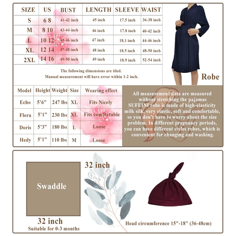 - Soft Mommy Robe and Swaddle Set -SUFEINI maternity robe are available in 5 sizes. The newborn receiving blanket is one size, 32inch * 32inch, headband are suitable for newborn head circumference 14"-19" (36-48cm) , aged 0-3 months. SUFEINI nursing robe and matching baby set Included-1 x Maternity Robe,1 x Swaddle Blanket,1 x Headband.