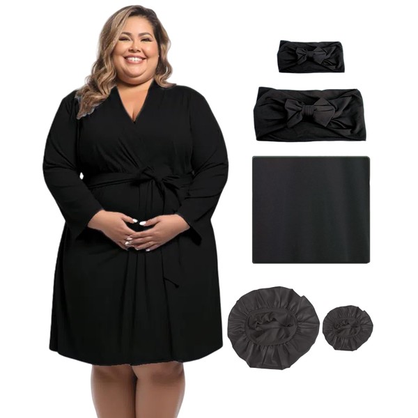 SUFEINI Plus Size Maternity Robe and Matching Baby Swaddle Blanket Set, Mommy Robe with Receiving Blanket Girls Boys Sleepwear (US, Alpha, 3X-Large, Plus, Regular, PZC10 Black)