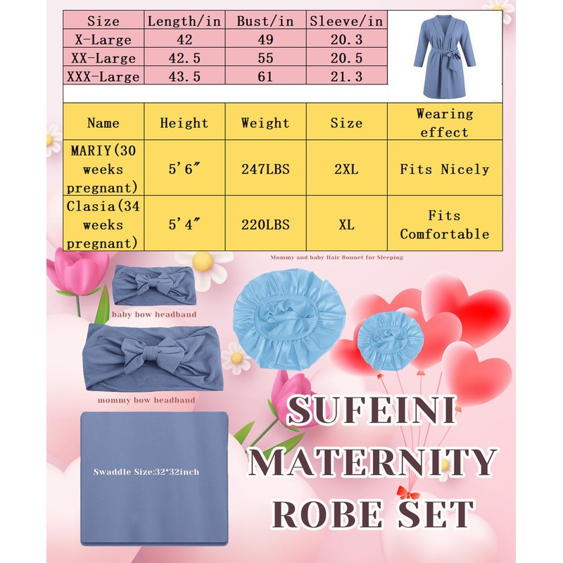 - Elegant & Practical Matching Accessories-This set includes a matching headband , stretchy hair bonnet and a soft swaddle (32x32 inches) for versatile use. The coordinated design of plus size SUFEINI postpartum robe adds a stylish touch for maternity photoshoots or special occasions.The milk silk maternity robe and coordinated matching wrap create elegant, picture-perfect harmony.