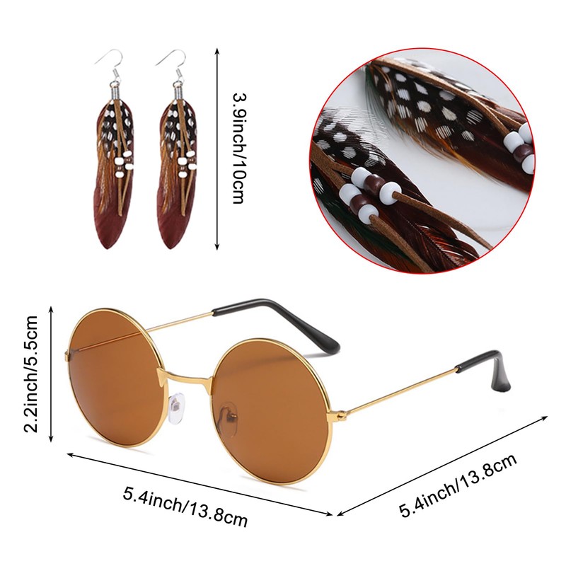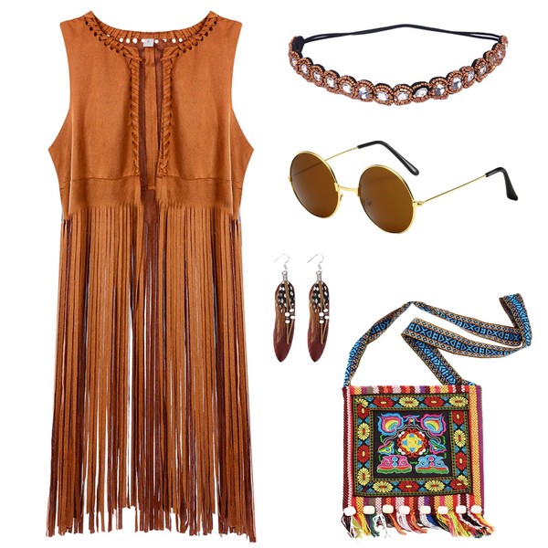 - TRANSFORMATION FOR WOMEN This hippie costume accessories set includes 1 x sleeveless hippie vest with tassels, 1 pair of boho feather earrings, 1 x bohemian crystal headband, 1 x vintage sunglasses and 1 x personalized handbag. The accessories of the hippie costume complete your hippie look for 70s and 80s themed parties.
