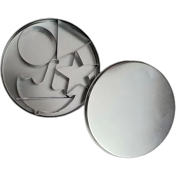 BISCUIT MOULDS: Biscuit sugar making tool set, sugar play set. Stainless steel biscuit cutter moulds, large round box can be used as a biscuit cutting platform as well as a candy storage jar.