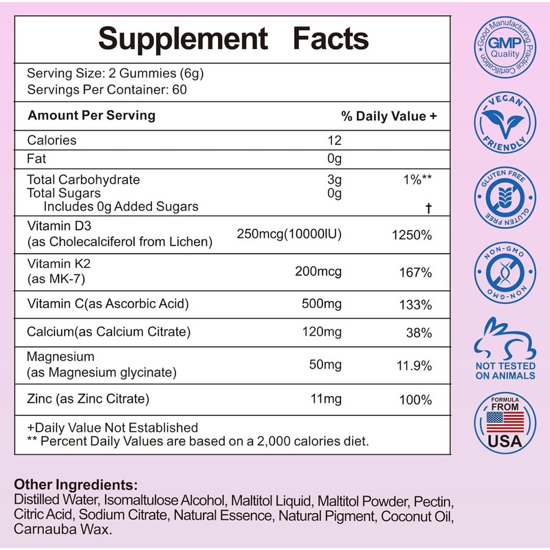 - π·ππππππ πππππππ:It contains D3,K2,Vitamin C,Calcium,Magnesium,Zinc,Multivitamin Gummies.Essential nutrients in each gummy for optimal health and vitality