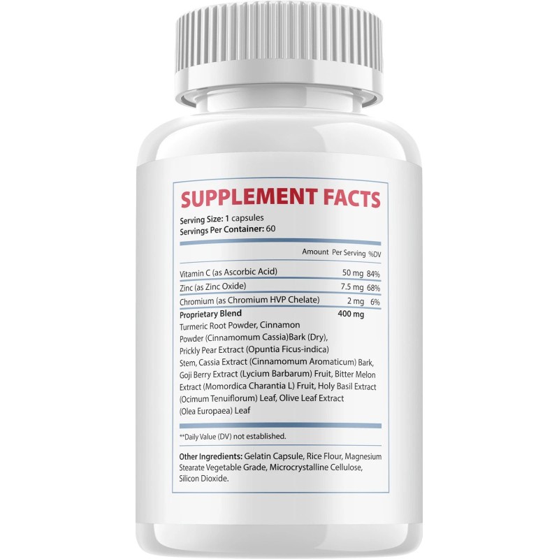 • Ingredients: Bitter Melon (Momordica charantia), Chinese Cinnamon (Cinnamomum cassia), Chromium, Holy Basil (Ocimum tenuiflorum), Olive Leaf, Prickly Pear (Opuntia), Turmeric, Zinc, Vitamin C, Stem, Goji, Ocimum