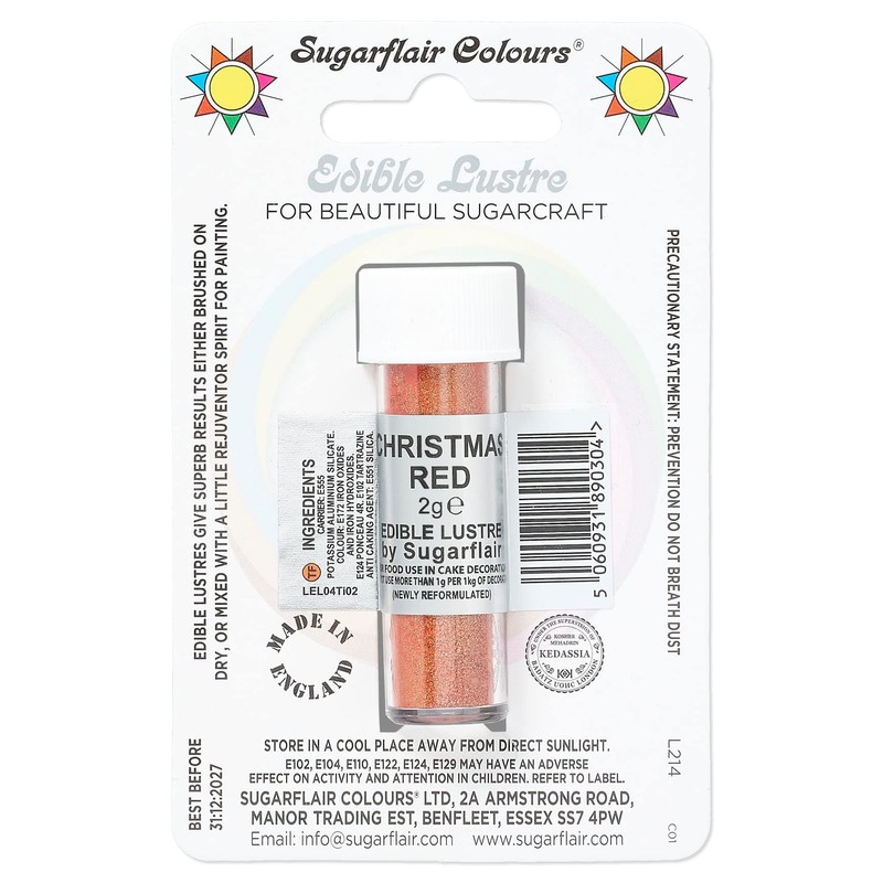 - Sugarflair Colours Christmas Red Edible Lustre Dust (E171 Free) is versatile and can either be brushed onto cakes and decorations or mixed with rejuvenator spirit to create an eye-catching edible paint for sparkling cakes or glamorous sugar cake decorations.