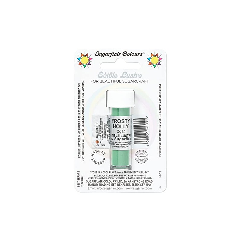 - Sugarflair Colours Frosty Holly Edible Lustre Dust (E171 Free) is versatile and can either be brushed onto cakes and decorations or mixed with rejuvenator spirit to create an eye-catching edible paint for sparkling cakes or glamorous sugar cake decorations.