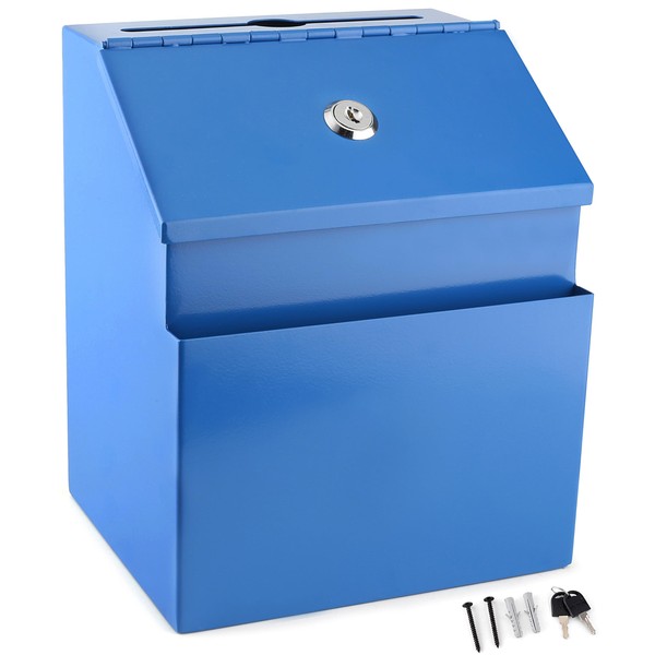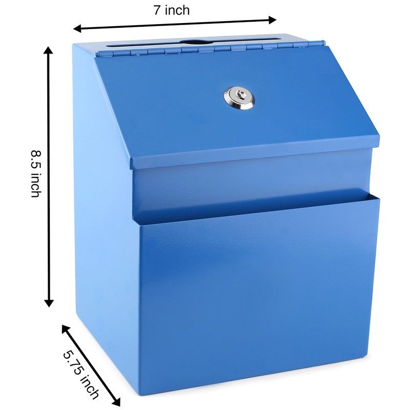 Suggestion Box with Lock and keys, Metal Wall Mounted Ballot Box, Iron steel Donation and Collection Drop Box 8.5" H x 6" W x 7" L with wide 5.5" Slot and front sheet holder (Blue)