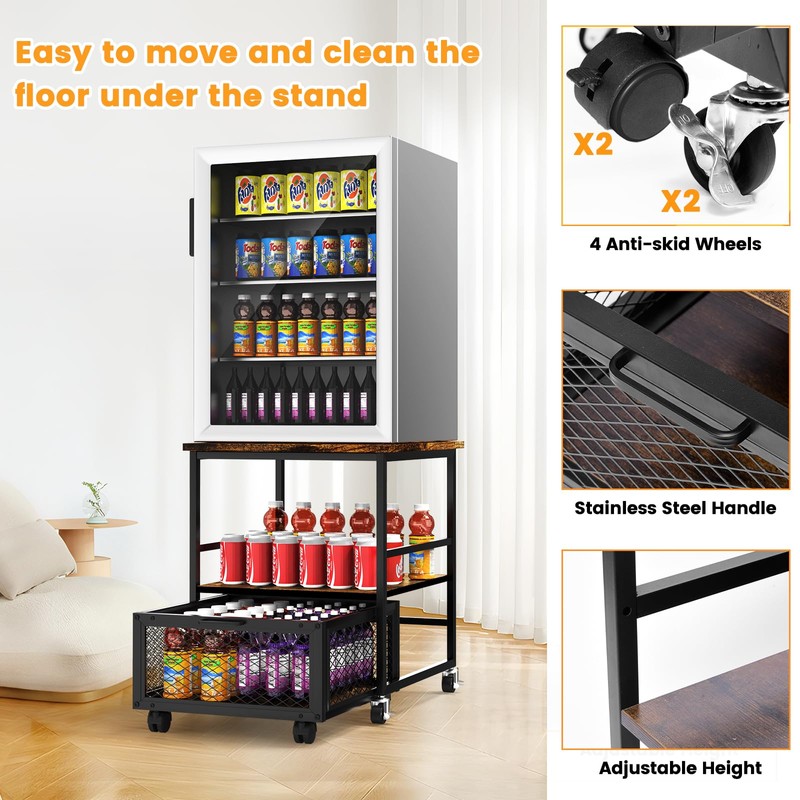 - 【Flexible Moving Wheels】 Equipped with 8 smooth-rolling swivel wheels, including 4 that lock in place for stability, our mini fridge stand ensures a secure and scratch-free experience on any surface. The removable drawer baskets feature convenient pull handles and fixed pivot corners, perfect for storing snacks, drinks, cups, and more.