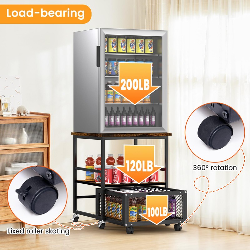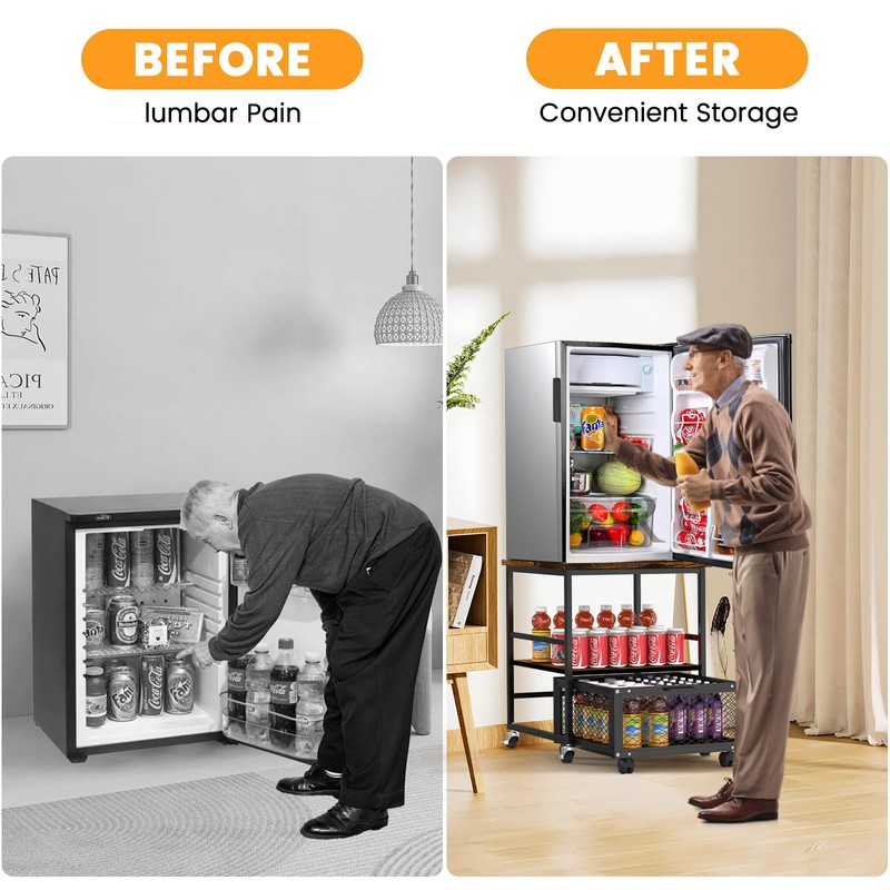 - 【Optimal Vertical Space Utilization】 Our mini fridge stand doubles as a kitchen cart, bar cart, side table, or utility cart. The sturdy metal mesh basket supports up to 110 lbs and is perfect for snacks, drinks, and more. Ideal for dorm rooms, apartments, RVs, kitchens, it’s the ultimate space-saving solution to keep your home neat and organized.