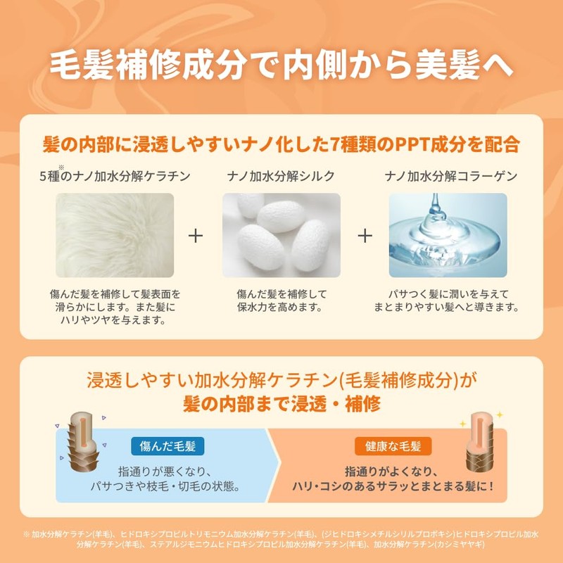- Formulated with 7 types of PPT ingredients that are easy to penetrate inside the hair (5 types of nano hydrolyzed keratin + nano hydrolyzed silk + nano hydrolyzed collagen). Hydrolyzed keratin easily penetrates and repairs the interior of the hair