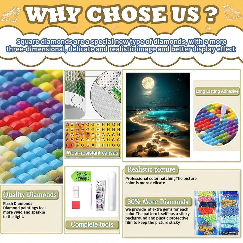 - What You Will GetDiamond painting square drill Includes1 HD painting canvas , 1 diamond painting pen, 2 red glue clay, 1 tweezers, 1 plastic tray and 24 resealable bags and enough colorful square diamonds (we added an additional 30% of square diamonds to prevent the occurrence of insufficient diamonds)