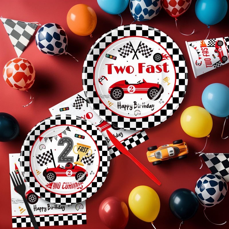 • 【Complete Set】Our two fast birthday party supplies dinnerware come complete with all the essentials for a seamless party experience including 24pcs 9'' two fast dinner plates, 24pcs 7'' race car dessert plates, 24pcs paper napkins, 24pcs paper cups, 24 sets of disposable forks. for race car two-year-old birthday party decorations