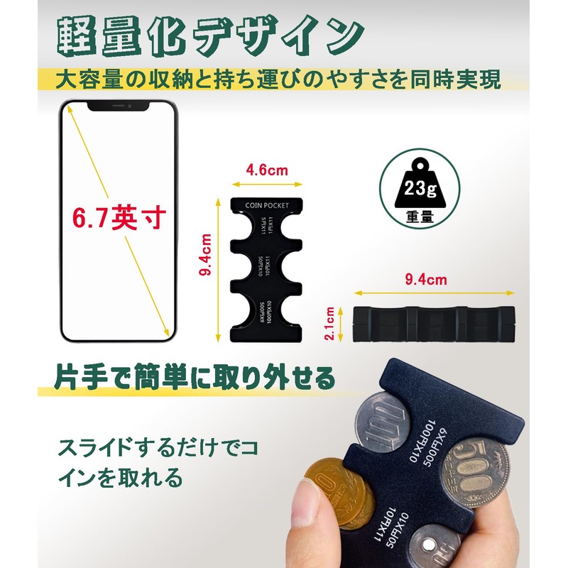 - One-touch Operation: Size: Approx. 3.7 x 1.9 x 0.8 inches (9.5 x 4.7 x 2 cm); Weight: 0.8 oz (23 g); Made of ABS resin, with excellent anti-slip If you use it, you can hold the case firmly with one hand, then place your finger on top of the coin you want to take it out, and then remove it smoothly, greatly reducing your payment